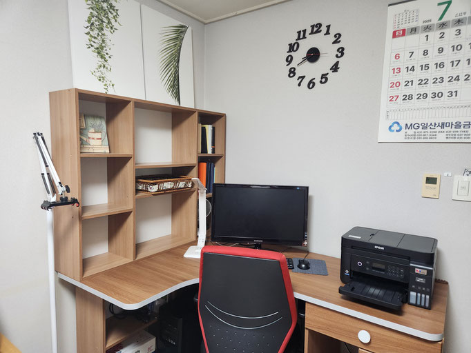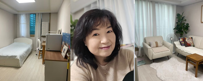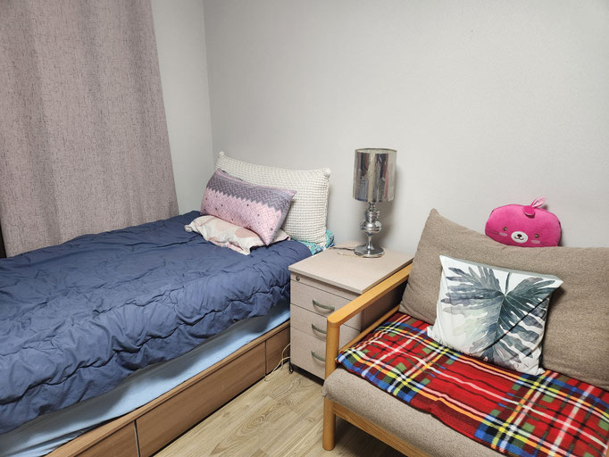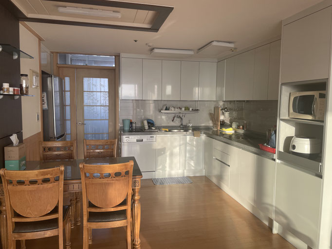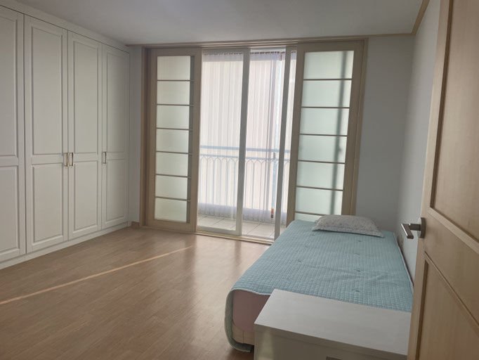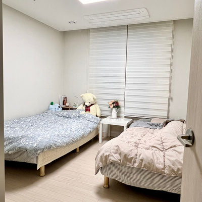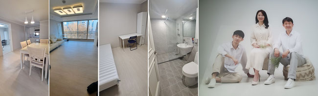 夫(大学教授)と私(個人事業主)の二人暮らしです。20代の子ども二人は別の場所(ソウル・セゴク洞)で生活しています。3部屋・2つのバスルームがある築浅アパートで、清潔に保たれています。ゲスト専用の個室は広く快適で、備え付けの収納、机、引き出し、扇風機、エアコン、小型冷蔵庫(44L)が揃っています。さらにゲスト専用のバスルーム(シャワー可)も用意されています。また、アパートには共用玄関があり、セキュリティ面でも安心です。近くには阿且山(アチャサン)と漢江の散策路があり、自然に恵まれた環境です。徒歩5分の場所に「ウォーカーヒルホテル」があり、便利で安全な地域です。