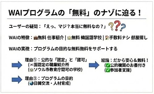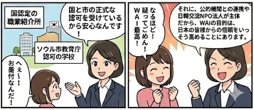 【無料職業紹介】 当法人と提携する韓国NPO法人は、韓国政府「職業安定法」第18条・19条に基づき正式登録された事業者です。この法的根拠のもと、信頼性の高い就職先を無料でご紹介します。日本語・韓国語双方に対応したカウンセリングを通じ、ご希望に沿った斡旋から雇用条件の確認まで、透明性の高い誠実なマッチングをお約束します。