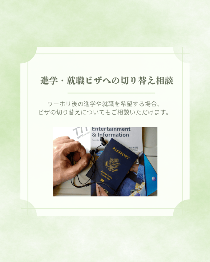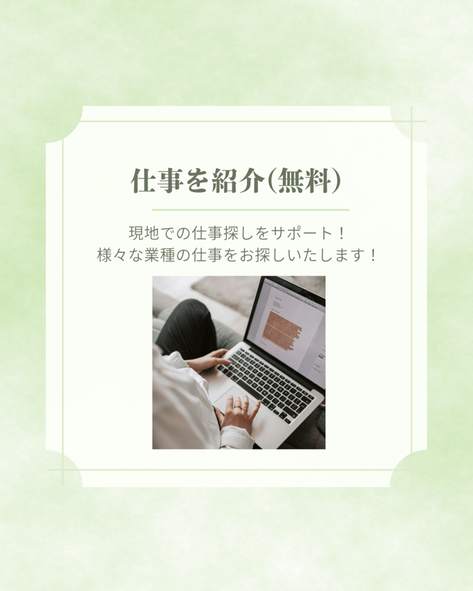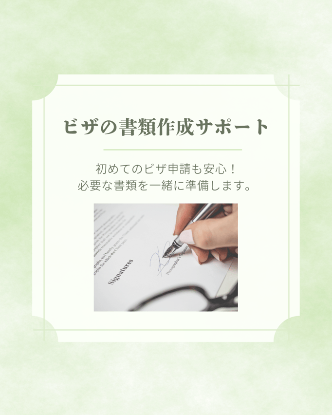 「ビザ書類の事前確認】 申請に必要な各種書類の案内・確認を、プロの視点で事前に行います。出国前の準備から、入国直後の生活情報、勤務条件の確認に至るまでをトータルサポート。制度の仕組みや注意点についても個別に分かりやすく解説し、万全の状態で渡航を迎えていただきます。