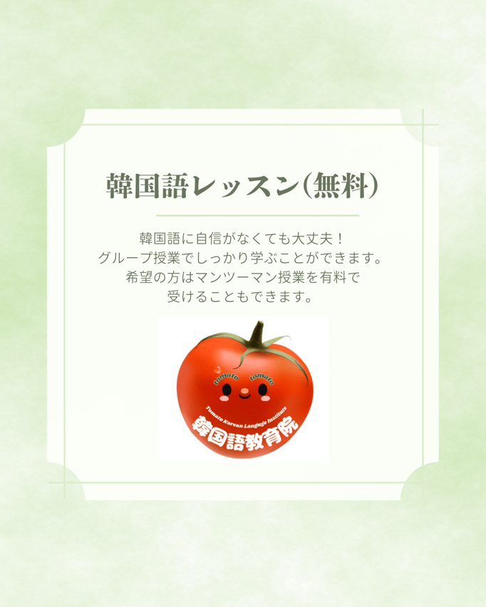【韓国語学校の登録確認書発行】 ソウル市教育庁認可の正式な教育機関「トマト韓国語学校」への学習登録を支援。最大6ヶ月間の授業料が無料となる本制度を利用するための「登録確認書」を事前に発行いたします。これはビザ申請や学習証明として有効であり、経済的な負担を軽減しつつ、安心して語学習得に専念できる環境を提供します。
